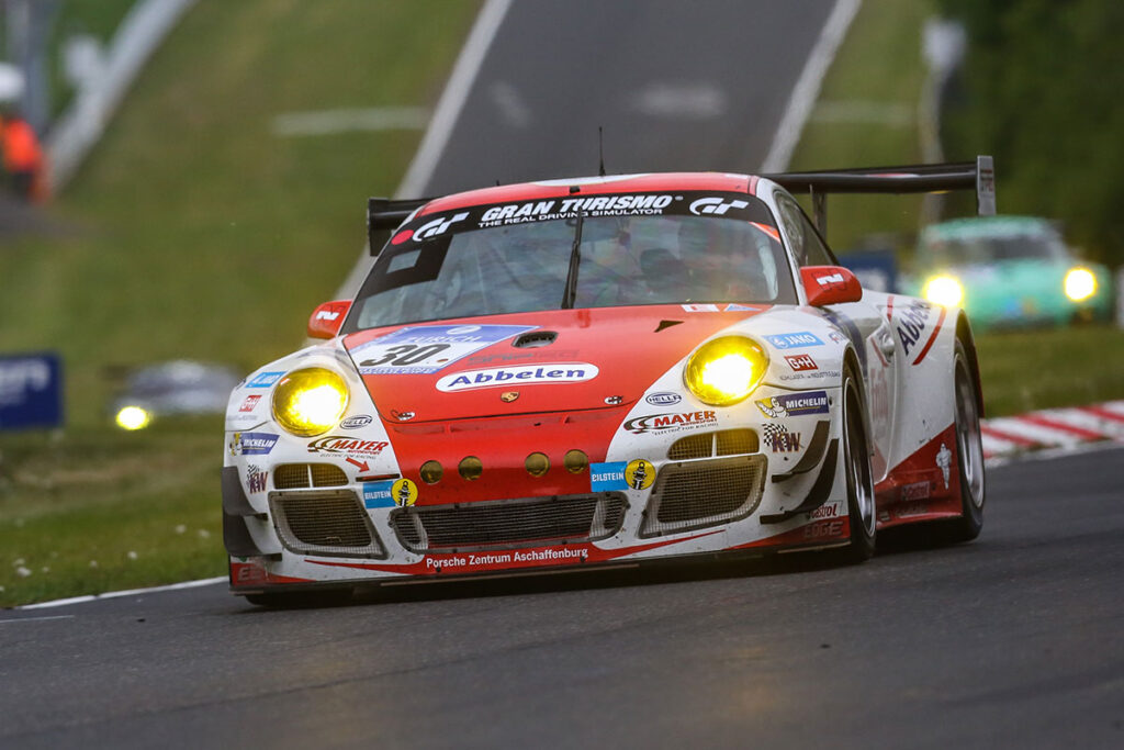 Die Dunkelheit am Nürburgring fordert ersten Tribut: Für das Frikadelli Racing Team mit Sabine Schmitz ist das Rennen vorzeitig beendet. Der 911er wurde nach einem Einschlag im Karussell stark beschädigt. Patrick Pilet, zu diesem Zeitpunkt am Steuer, wurde nach Auskunft der Rennleitung zur medizinischen Untersuchung ins Medical Center gebracht. Bis dahin war die ‚schnellste Frikadelle […]