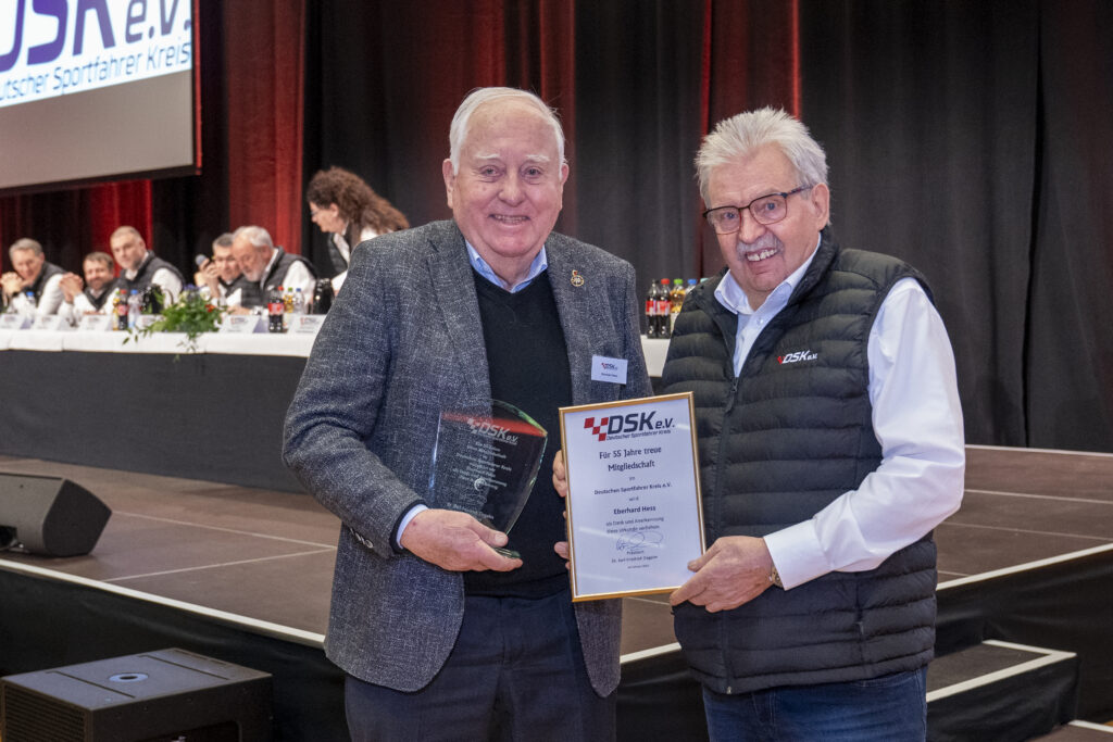 Traditionell ehrte der DSK langjährige Mitglieder für ihre Treue. Besonders herausragend: Kurt Frieß und Eberhard Hess, die seit 60 und 55 Jahren dem DSK angehören. Leider konnte Jubilar Frieß seine Auszeichnung nicht persönlich entgegennehmen. Hess, der sich zwischen 1975 und 1981 im Präsidium des DSK engagierte – zunächst als Beisitzer, später als Schatzmeister und Vize-Präsident –, kommentierte sein Jubiläum mit einem Augenzwinkern: „Das kann jeder nachmachen.“ Bereits 2015 wurde er mit der Graf Berghe von Trips Medaille in Silber ausgezeichnet. Neben seinem Engagement im DSK ist er auch dem Dürener Motorsportclub e.V. und der Scuderia Colonia eng verbunden.