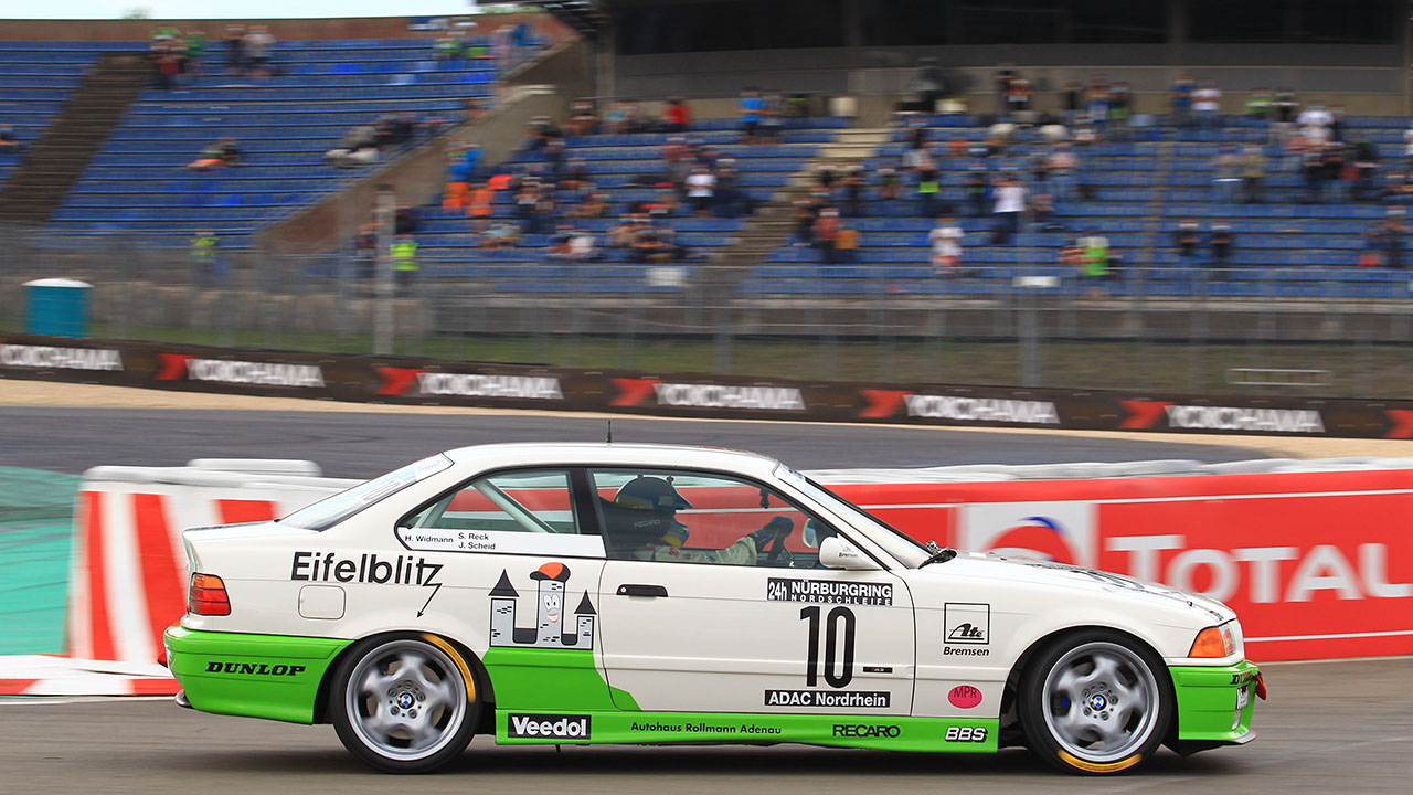 Hoch emotionaler Moment beim ADAC TOTAL 24h-Rennen: Die 30 Minuten vor Beginn der ersten der beiden Top-Qualifying-Sessions standen voll und ganz im Zeichen der vor kurzem verstorbenen Nürburgring-Legende Sabine Schmitz. DSK-Präsidiumsmitglied und Nordschleifen-Urgestein Johannes Scheid, der 1996 und 1997 gemeinsam mit Schmitz am Steuer des BMW M3 „Eifelblitz“ das 24-Stunden-Rennen gewonnen hatte, drehte in einer Replika des Siegerfahrzeugs von 1996 eine Ehrenrunde um die Nordschleife.