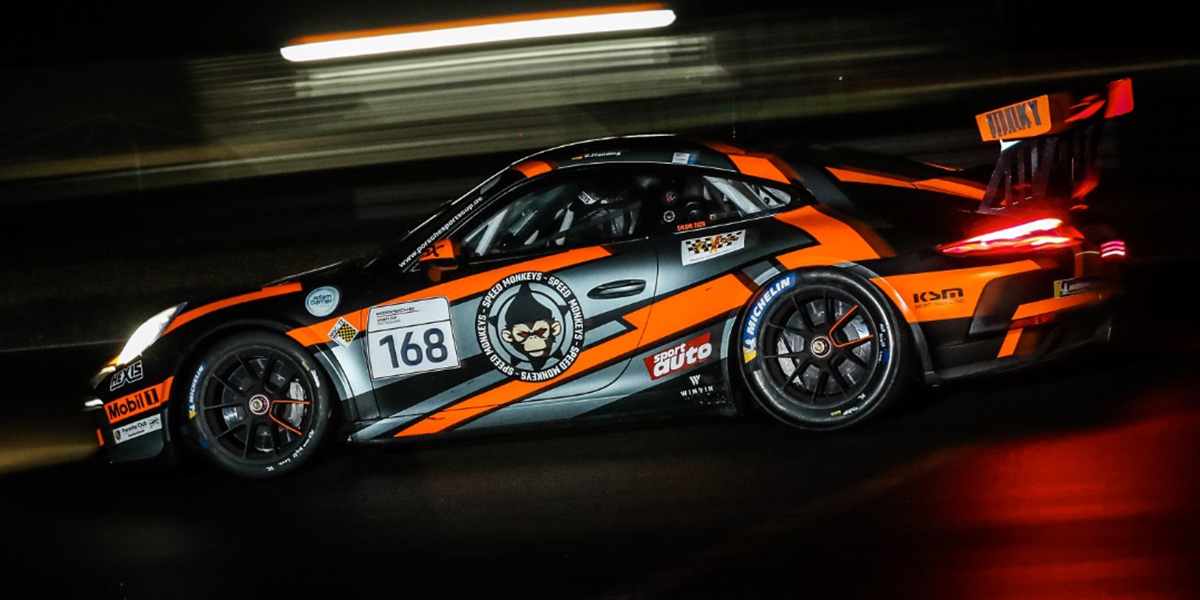 Nach dem Qualifying hätte wahrscheinlich niemand auch nur einen Cent auf den Porsche mit der Startnummer 168 gesetzt. Donar Munding musste abgeschlagen vom 20. Startplatz in das erste Nachtrennen der Serie starten. Die Taktik des Teams, den Youngster mit angefahrenen Slickreifen in das Rennen auf abtrocknender Strecke zu schicken, und die fahrerischen Qualitäten des 18-Jährigen ließen aber bereits nach Runde eins erkennen: Da geht was. Nach dem Start kämpften viele Konkurrenten damit, die frischen Reifen auf dem kühlen Asphalt auf Temperatur zu bringen. Mit den bereits angefahrenen Reifen konnte Munding dagegen sogleich richtig durchstarten. In der ersten Rennrunde fuhr er sensationell von Platz 20 bis auf die dritte Position vor. Nach einer Safetycar-Phase attackierte er in den letzten drei Runden noch einmal, rückte in der vorletzten Runden auf Platz zwei vor und setzte sich in der finalen Runde in der letzten Kurve sogar an die Spitze. Im packenden Fotofinish gewann Munding mit einem Vorsprung von 0,05 Sekunden vor seinem Verfolger. „Ich bin zuvor noch nie in der Nacht gefahren. In der letzten Runde habe ich nochmal versucht, alles rauszuholen. Der Sieg ist ein riesiger Erfolg für mich“, sagte Munding. Das sensationelle Top-Resultat für die Speed Monkeys machte Lars Joosten perfekt, der sich im schwarz-neongrünen Cup-Porsche auf den dritten Platz verbessern konnte. Im Ziel lagen die Top 3 innerhalb von nur 0,621 Sekunden und sorgten damit für einen der engsten Zieleinläufe im Super Sports Cup. Im ersten Rennen des Wochenendes wurde Donar Siebter, im Rennen am Sonntag Dritter.
